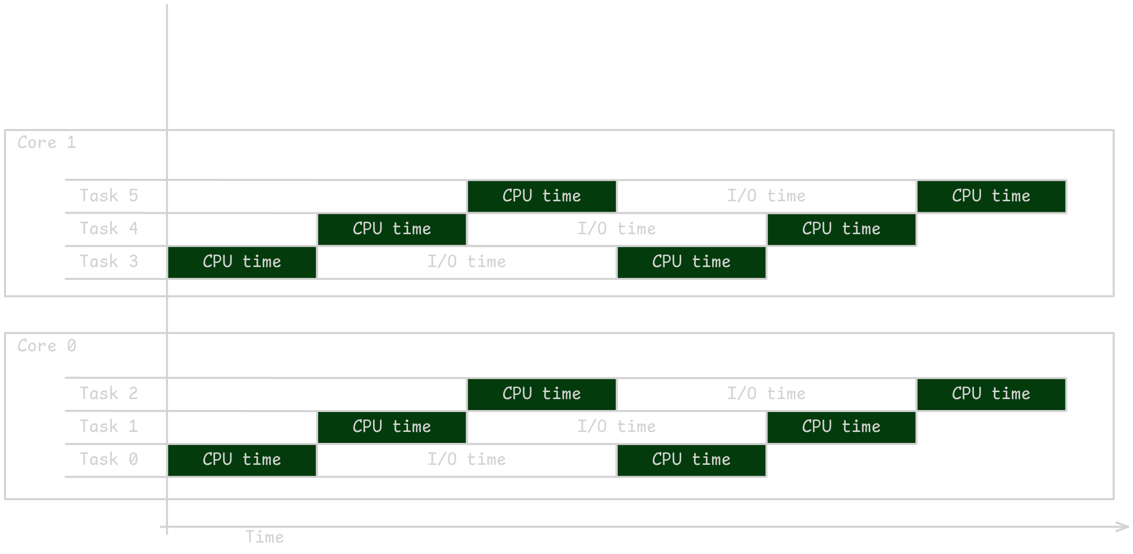 Hay que tener en cuenta que esto no puede lograrse ejecutando tareas sobre un mismo hilo, o hilos sobre un mismo núcleo. El paralelismo real (ejecutar varios hilos en el mismo ciclo de reloj) solamente puede ser logrado utilizando múltiples núcleos físicos del procesador, ejecutando distintos hilos en distintos núcleos a la vez.